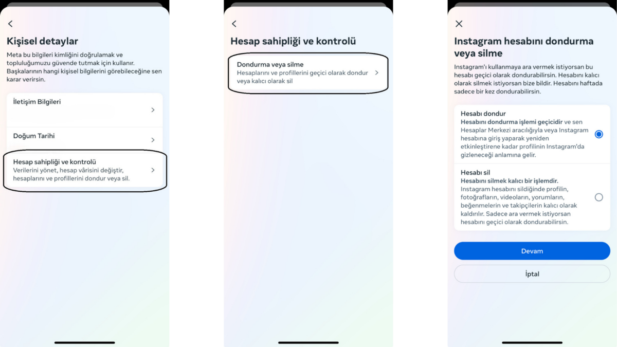 - Kişisel bilgiler > Hesap sahipliği ve kontrolü > Devre dondur veya silme öğesine dokunun.