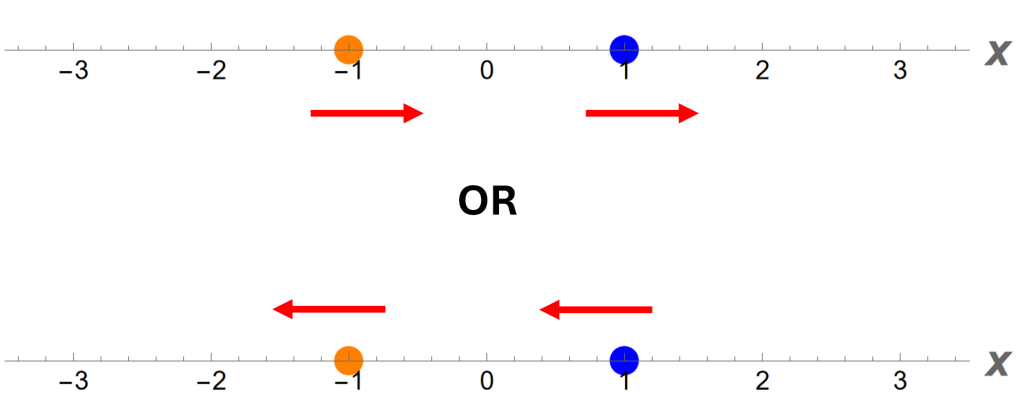 Üstteki olasılık değişmeden korunduğu için Şekil 10a ile Şekil 8a aynıdır. Ancak Şekil 10b için durum farklıdır çünkü Şekil 8b’de x1=+1 ve x2=+3 olan yıldız artık x1=+3 ve x2=+1 konumuna taşınmıştır. (Karşılık gelen ok hala aynı yönü gösterir çünkü parçacıkların hareketleri önceki ile aynıdır.)