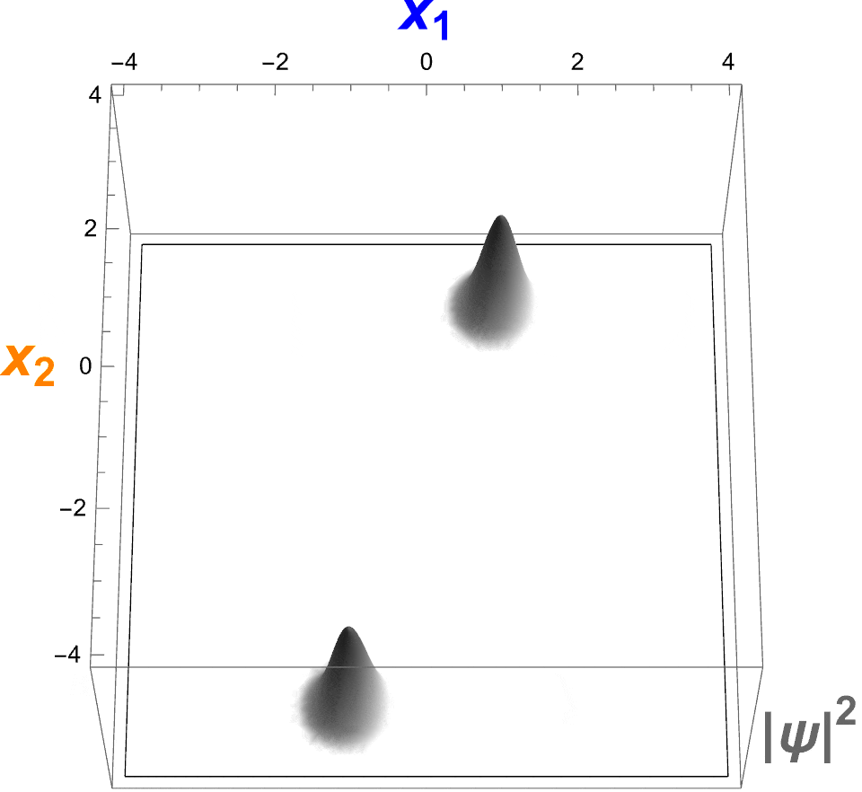 Bunun yerine elimizde olasılıklar uzayı üzerinde tanımlı tek bir dalga fonksiyonu (Ψ(x₁, x₂)) vardır: Burada x₁ ekseni (yatay olan) 1 numaralı parçacığın (mavi) konumunu ve x₂ ekseni (dikey olan) 2 numaralı parçacığın (turuncu) konumunu temsil eder.